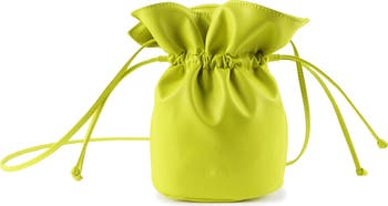 Italian-made vegan leather shapes this sustainable and slouchy bucket bag topped with a slim drawstring and slim crossbody strap.