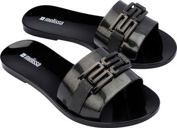 Signature logo hardware stands out against the glossy vamp strap of a minimalist slide sandal infused with the brand's signature fruit scent.