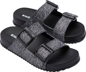 A denim print adds to the playful vibe of this buckle-strap sandal crafted from signature fruit-scented PVC.