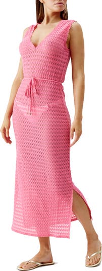 Goldtone-tipped ties tether the fit of this sheer cover-up dress featuring dainty open-knit stitches and easy side slits.