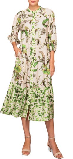 A botanical print sweeps across this three-quarter-sleeve shirtdress cut to a midi length and outlined with handy pockets.