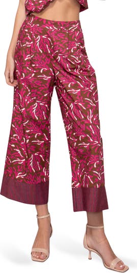 Crisp pleats add subtle structure to these cropped, wide-leg pants featuring a vibrant floral pattern and striped hems.