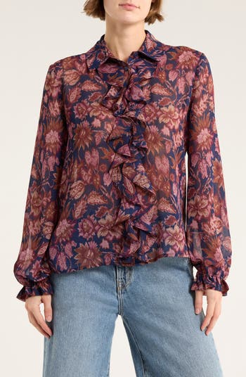 Floaty ruffles along the placket further the airy charm of this chiffon button-up shirt covered in a print.