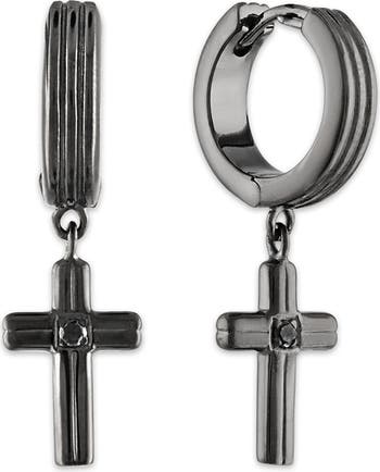 Black diamonds sparkle from the cross drops of textured huggie hoop earrings crafted from sterling silver with a dark rhodium finish.