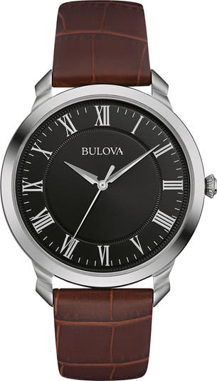 A croc-embossed leather strap secures the fit of an elegant watch powered by a reliable three-hand quartz movement to keep up with your polished style and day-to-day activity.