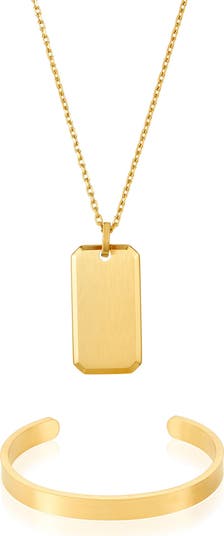 Instantly elevate your off-duty looks with this warm 14-karat gold plated set featuring a satin-finished dog tag necklace and a cuff bracelet.