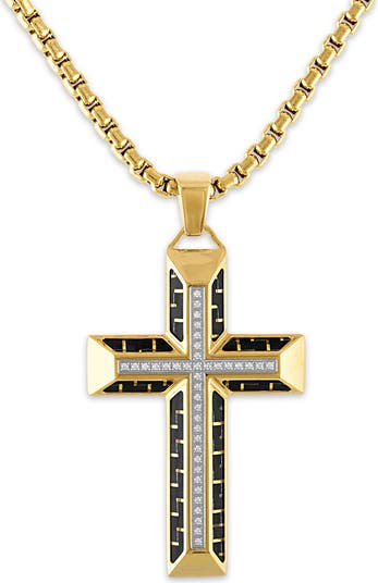 Show your faith with this stainless steel box-chain necklace suspending a cross pendant inset with carbon fiber and round diamonds for elegant shine.