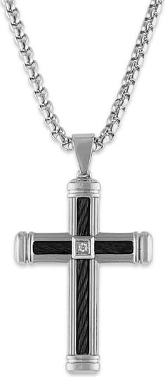 A twisted black cable and round diamond highlight the cross pendant of this classic box-chain necklace crafted from durable stainless steel.
