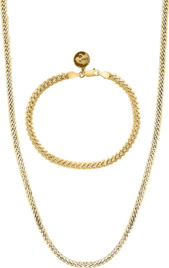 A wheat-chain necklace and coordinating bracelet plated in 14-karat gold are a perfect way to bring modern elegance and subtle shine to elevated looks.