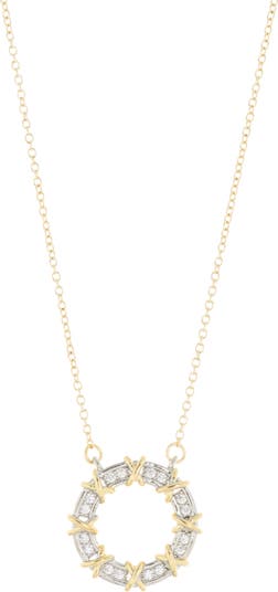 A dainty chain necklace features a circular pendant glimmering with cubic-zirconia crystals and highlighted by an 18-karat gold-plated finish.