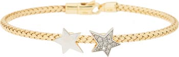 Diamond-embellished fixtures add a shining finish to an elegant and stackable bracelet style fashioned from fine metals.