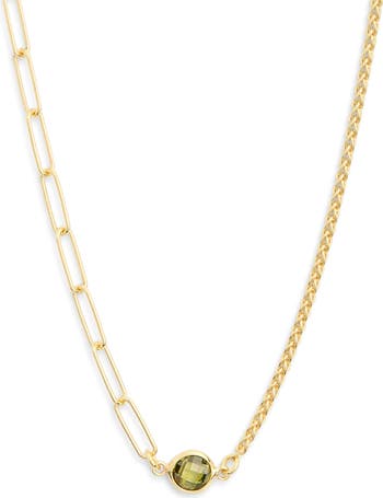 A faceted crystal is bezel set between a pair of mixed chains finessed in goldtone plating for a lasting luster.