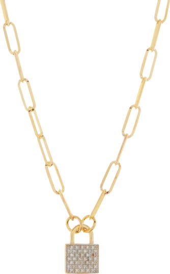 Pavé diamond adorn a padlock pendant suspended from a paperclip-chain necklace.