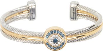 - - Two-tone twisted cable bracelet with pave CZ evil eye station - Approx. 0.5" width - Imported