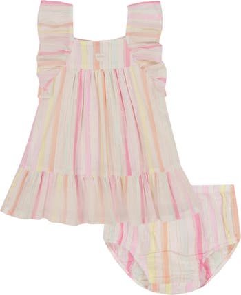 Metallic threads shimmer gently through the striped pattern of this charming kids' set completed with a ruffled tunic dress and coordinating bloomers.