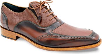 Textured leather brings posh distinction to the vamp of a Spanish-crafted oxford shaped with a brogue-trimmed apron toe.