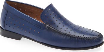 A moc-stitched toe enhances the classic style of a smooth leather loafer peppered with breathable perforations and lifted by a low block heel.