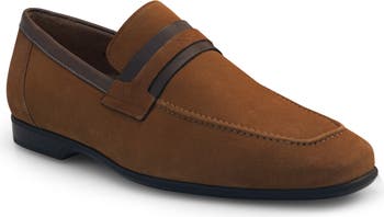 Buttery suede with smooth leather trim compose this Spanish-made driving loafer whose handmade construction brings sleek counterpoint to the distinctive styling.