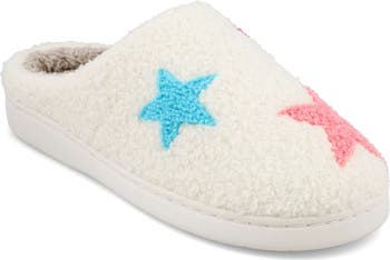 High-pile fleece furthers the comfort of a slipper lofted by a chunky platform and finished with a cute graphic.