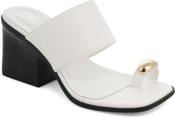 A square toe and stacked block heel balance a contemporary sandal fashioned with a toe loop with gleaming hardware.
