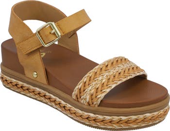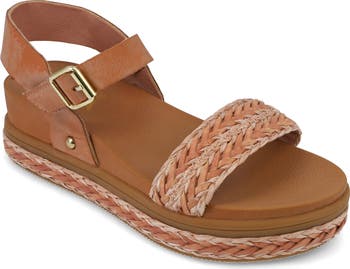 Ropy, topstitched espadrille-style braiding wraps the platform of a breezy ankle-strap sandal fitted with a lightly cushioned footbed.