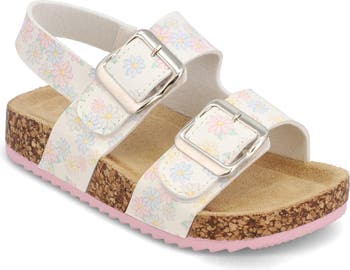 A playful pattern adds kid-approved charm to the adjustable straps of a slingback sandal set on a low, cushy platform.