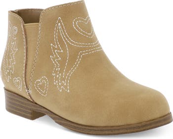 High-contrast topstitching channels the Western aesthetic on the vamp of a bootie crafted from supple faux suede.
