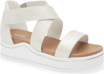 A hook-and-loop vamp strap adds an easily adjustable finish to the wide crossover vamp straps of a lightweight sandal supported by a sporty, bright-white flatform sole ready for the playground.