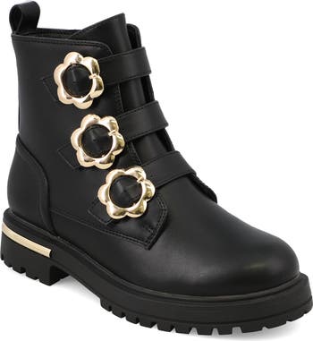 Polished flower-shaped hardware defines the buckled straps atop a faux-leather bootie ground on a durable lugged sole for increased traction in every stride.