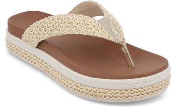 Give their warm-weather looks a little boost with this platform flip-flop topped with summery woven straps.