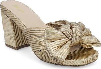 A voluminous knot centers the charming vamp bow on a soirée-ready slide sandal rendered in a pleated fabric and lofted by a wrapped block heel.