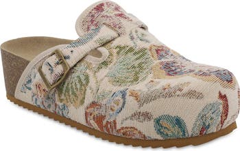An anatomical footbed and cork-and-latex–cushioned platform offer lasting comfort in this fashion-forward tapestry clog.