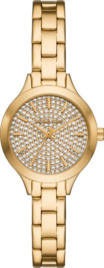 A slender bracelet and glittering dial embellished with crystal pavè amps up the glamour of this quartz-powered timepiece polished to a high shine.