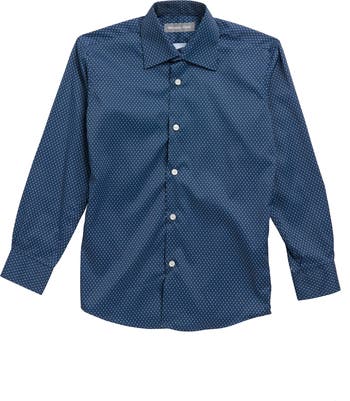 Crisp and comfortable fabric defines a polished paisley patterned dress shirt cut for your kiddo.