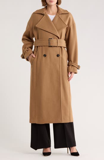 Layer your cool-weather outfits with timeless panache in a belted, double-breasted trench cut from a wool-forward blend in a knee-length silhouette. Broad notched lapels and buckled cuffs add to the vintage jetsetting vibe.