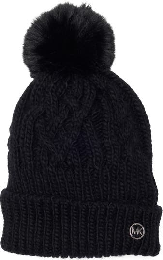 Stay cheery in the cold with this cozy knit beanie topped with a faux-fur pompom.