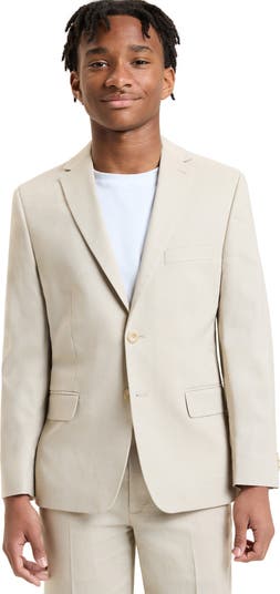 Give your kid polished style with this khaki solid linen-blend sport coat framed by notched lapels and flap pockets.