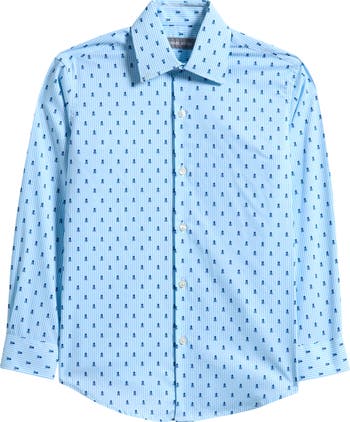 Give your kid polished style with this skull and stripe printed dress shirt cut from wrinkle-resistant fabric with comfortable stretch.