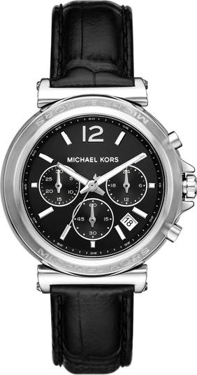 A croc-embossed leather strap distinguishes this chronograph watch boasting three-hand movement, three subdials and a clear date window.