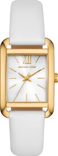 Minimal details give a sophisticated look to the dial of this brightly polished timepiece set on a buttery-soft leather strap.