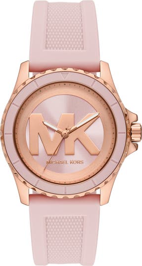 The brand's iconic Everest silhouette defines a polished timepiece updated with a silicone band and brushed sunray dial overlaid by a distinguishable 'MK' motif.
