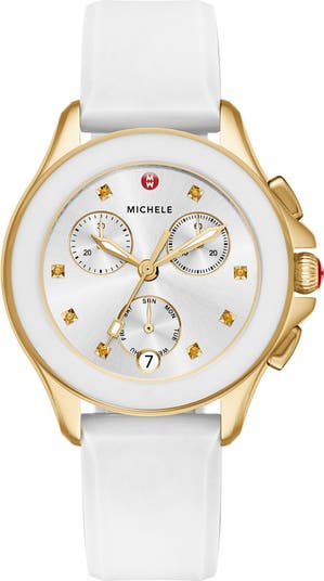 Sparkling topaz stones mark the dial of a casually luxurious chronograph watch set on a smooth silicone strap. As always, you have the option to customize your timepiece with any of MICHELE's premium 16mm straps to create a look that fits your personality
