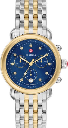 A navy blue mother-of-pearl dial features diamond bezel-set markers and a trio of subdials on this bracelet watch finished in bright two-tone polish.