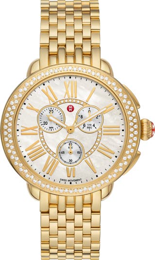 More than one hundred glittering diamonds circle the case and dial of a Swiss-movement timepiece with three sub-eyes for precise timekeeping. The seven-link bracelet can be interchanged with any coordinating MICHELE 18mm band for a customized look.