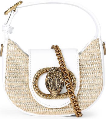 This compact hobo in a metallic basketweave is branded with an iconic bejeweled eagles head.