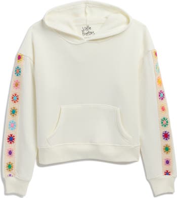 Colorful crochet trim brings boho‑chic charm to this cotton-forward hoodie sized just right for your creative kiddo.