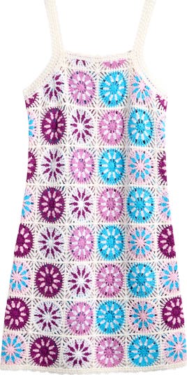 Your kiddo will love the trendy vibes of this airy knit cover-up dress covered in vibrant medallions exuding ultimate summer style.
