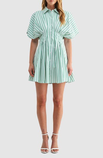 This striped shirtdress features curve-enhancing pleats, wide dolman sleeves and a smart collar.