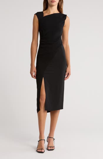 Asymmetric ruching sculpts the silhouette of this flowing midi dress framed by an asymmetric neckline for head-turning impact.
