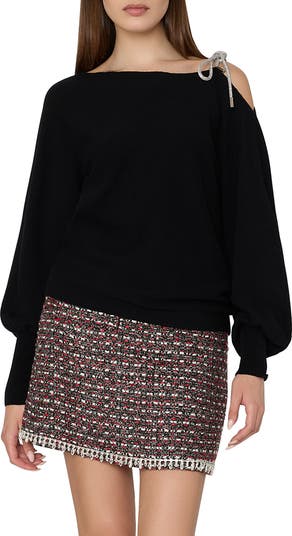 Billowed bishop sleeves sweetly frame a woolly cashmere-kissed sweater updated in a shoulder-baring silhouette and anchored with a crystal-studded tie.
